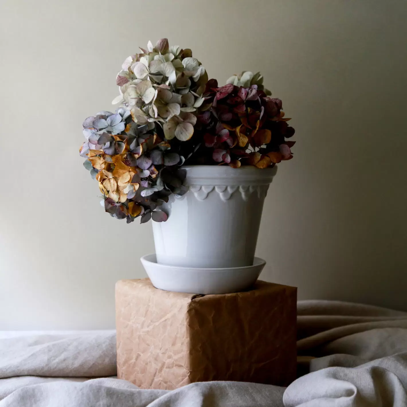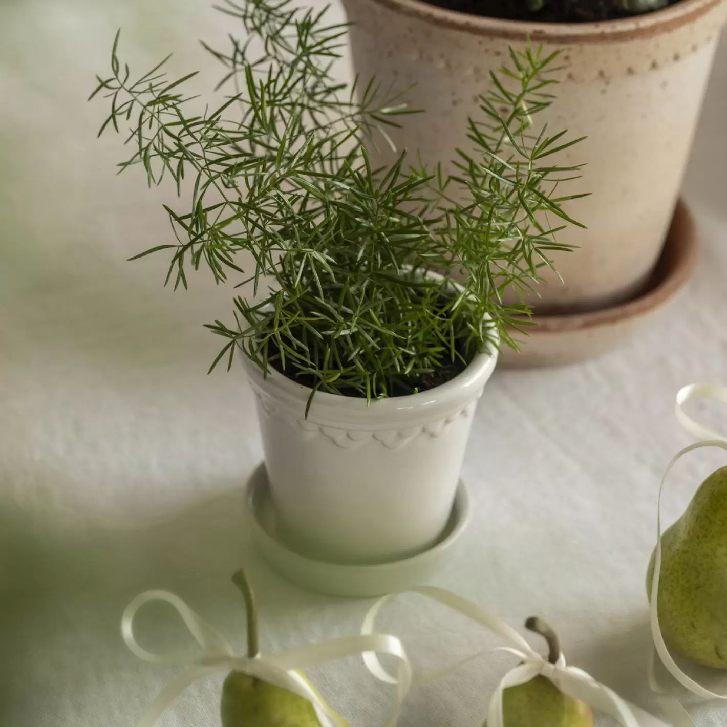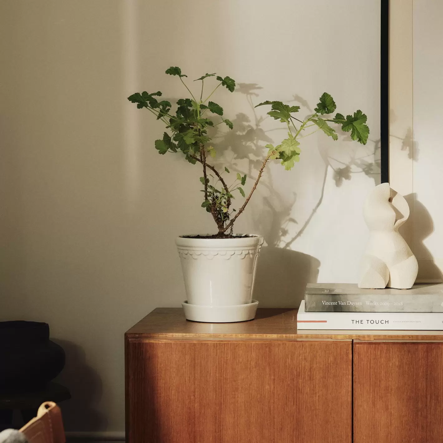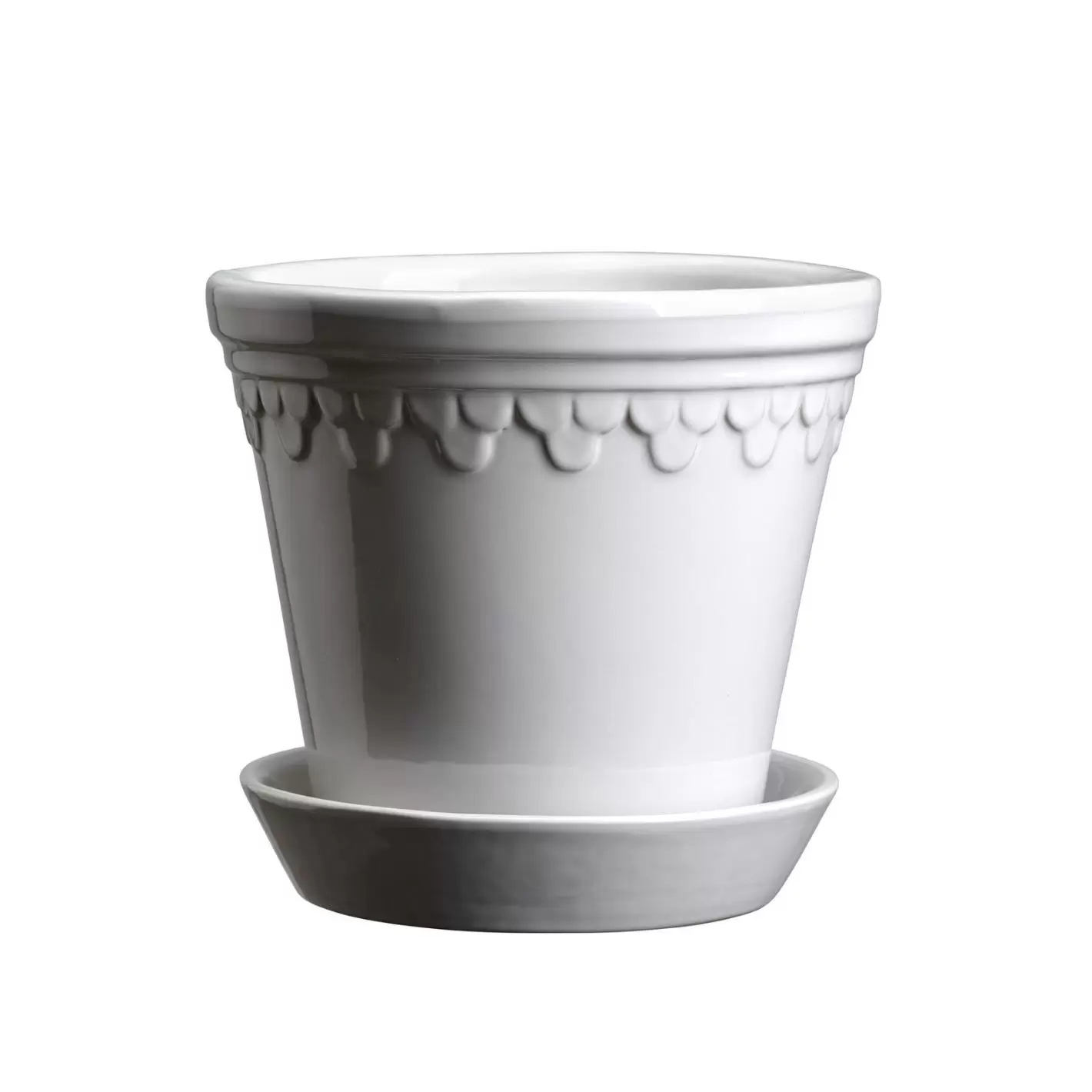 Urtepotten er håndglaseret med en fin hvid glasur, som fremhæver mønsteret langs kanten og lerets karakter. Potterne kan bruges både ude og inde, de er lavet af kvalitetsler, som er brændt ved meget høje temperaturer, og underskålene er helt vandtætte.