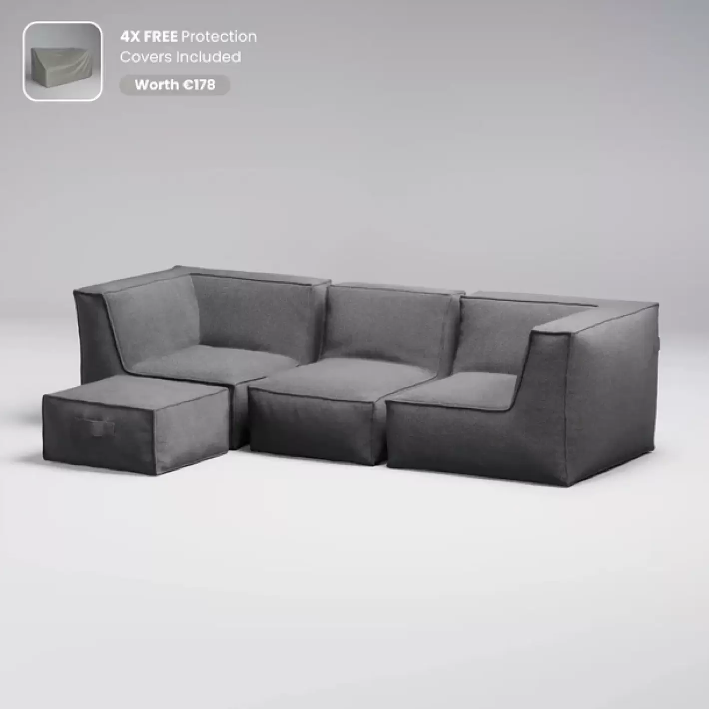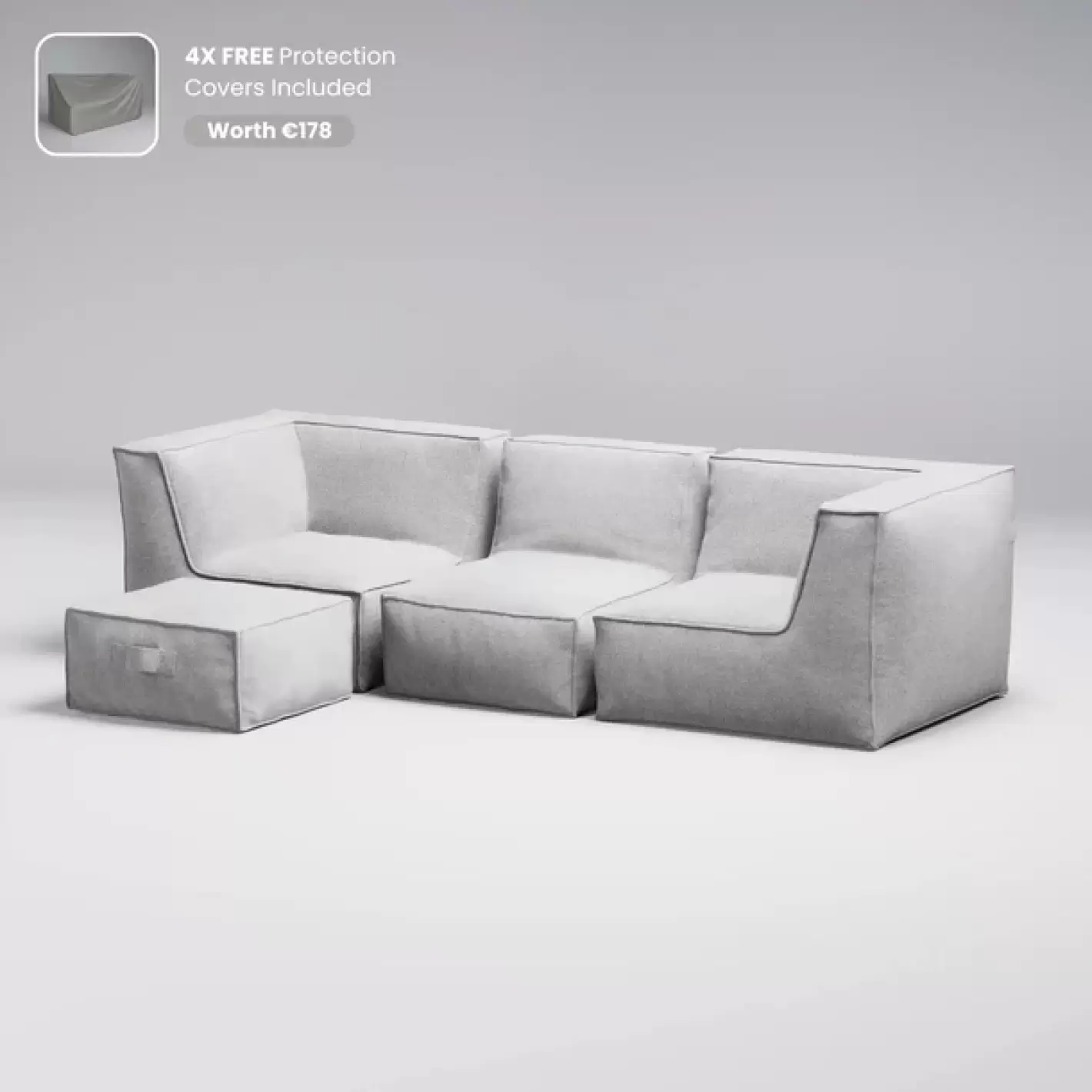 Dette sæt består af 2 hjørnemoduler, 1 loungestol og 1 puf, som kan sættes sammen til en lang sofa, men modulerne fungerer også perfekt som separate siddemøbler, og kan naturligvis også kombineres med alle seriens andre moduler til et komplet loungeområde efter eget valg.