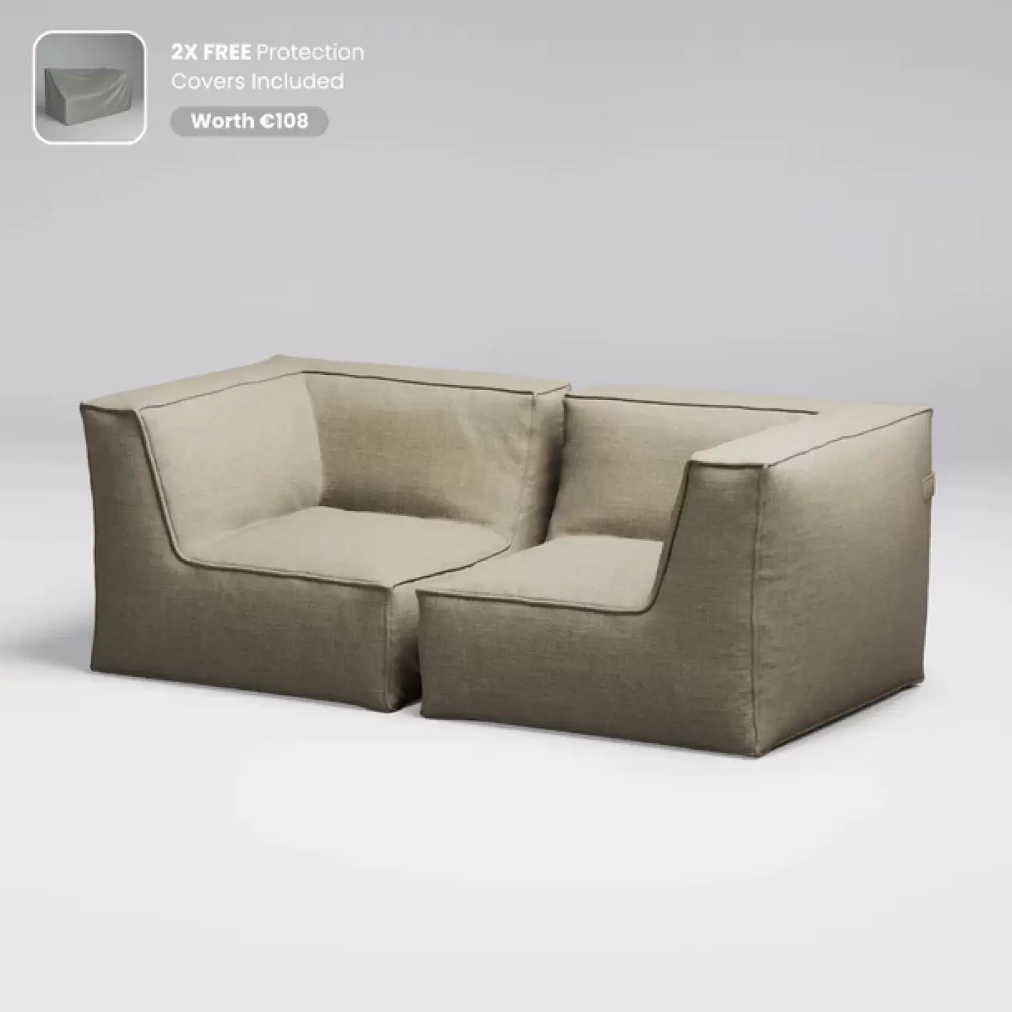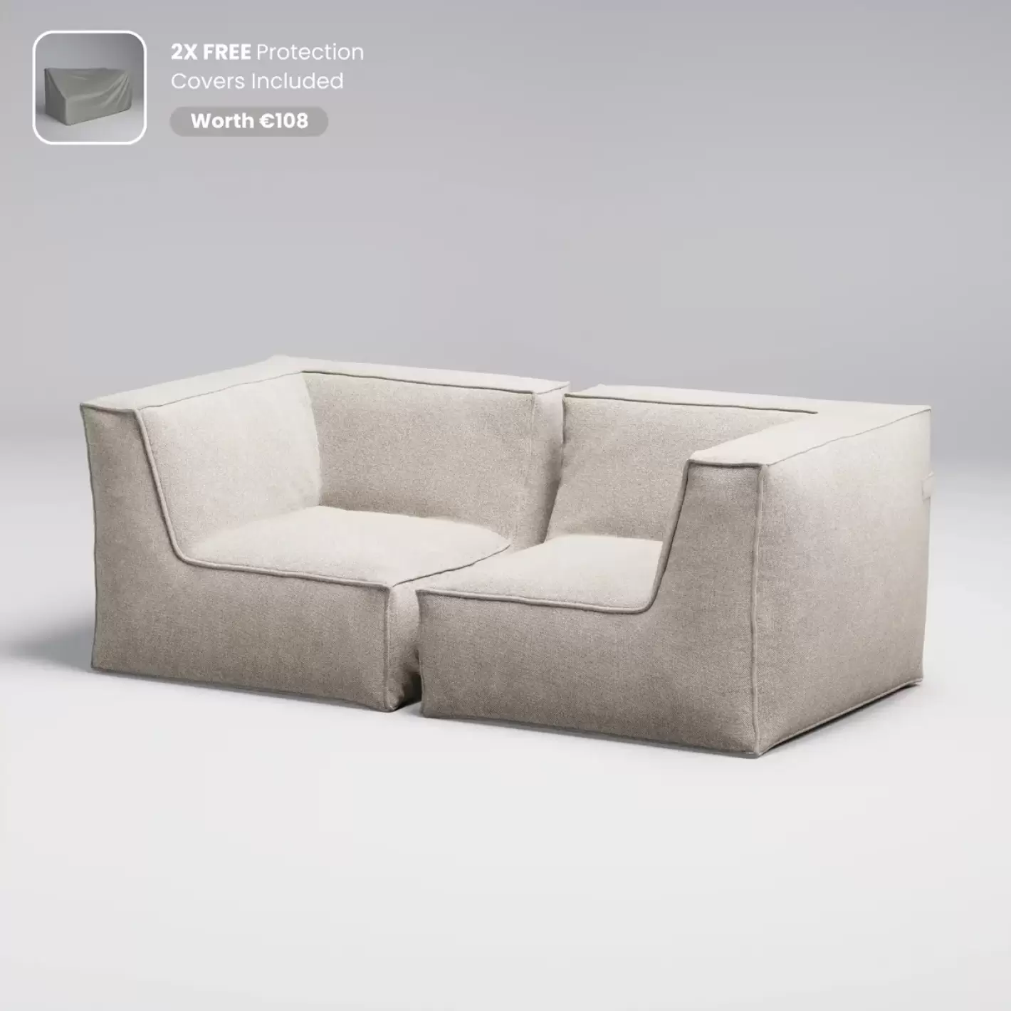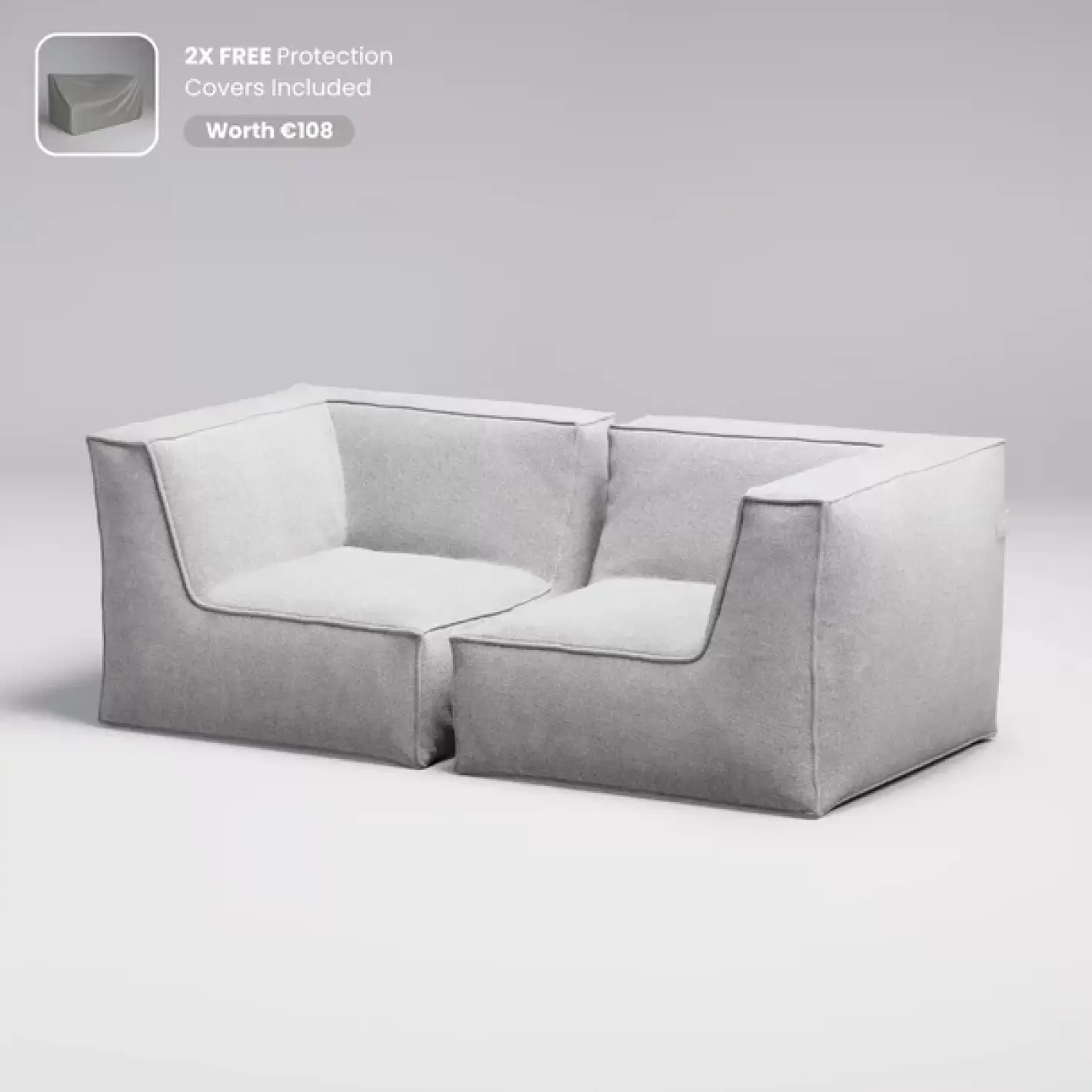 Dette sæt består af 2 hjørnemoduler beklædt med Olefin, et tekstil som er fremstillet af en blanding af polypropylen og polyethylen. Stoffet er behandlet med UV-beskyttelse og er resistent overfor både saltvand, klorvand fra swimmingpoolen og skimmelsvamp - modulet har fyld af PU-sofaskum, som er beskyttet i et vandtæt kammer.